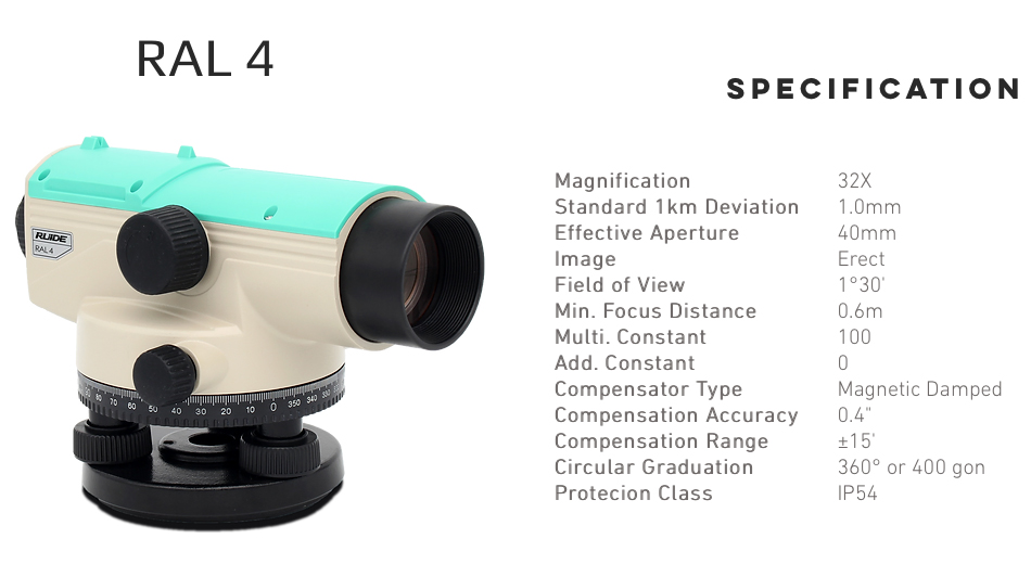Accuracy: 1.5mm Magnification: 32X Magnetic Damped Compensator Compensation Accuracy: 0.4″ Compensation Range: +15′ IP54